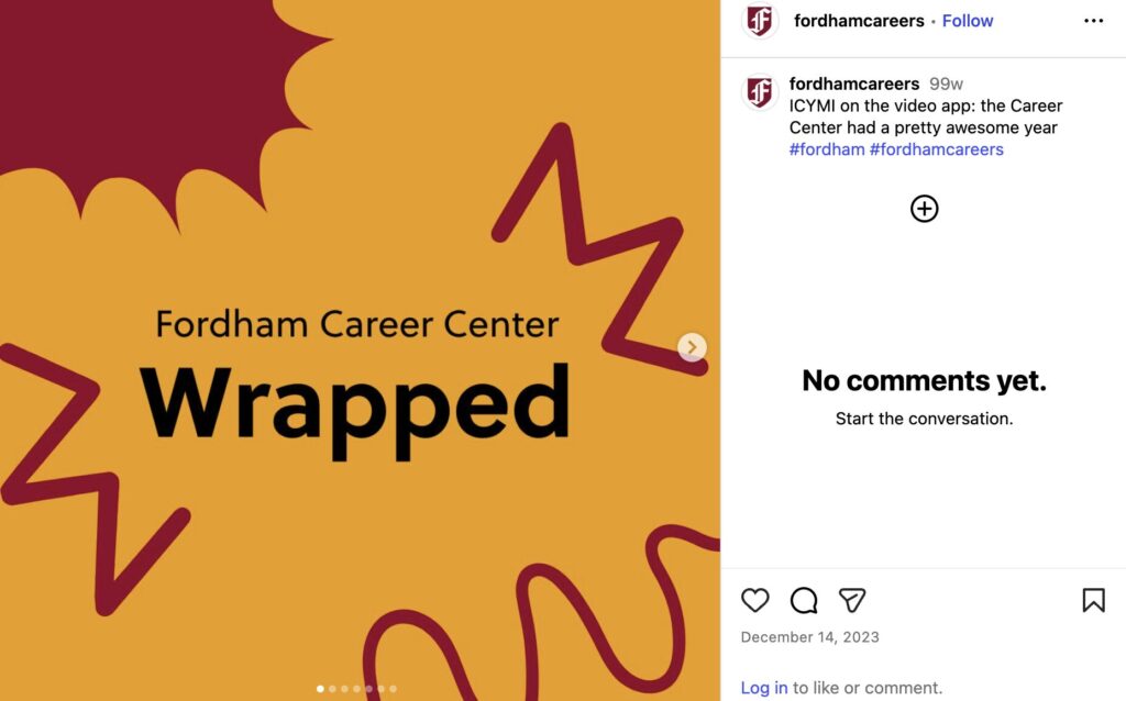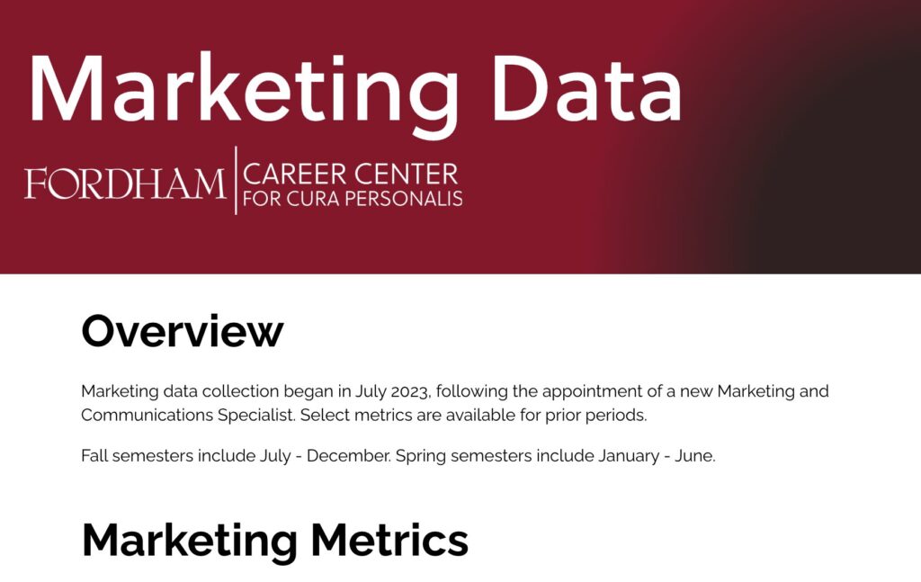 Guiding all brand and media efforts for Fordham’s Career Center, I serve as the sole communications leader, managing a part-time staff member and over 20 student contributors. My responsibilities encompass the full marketing funnel, including: